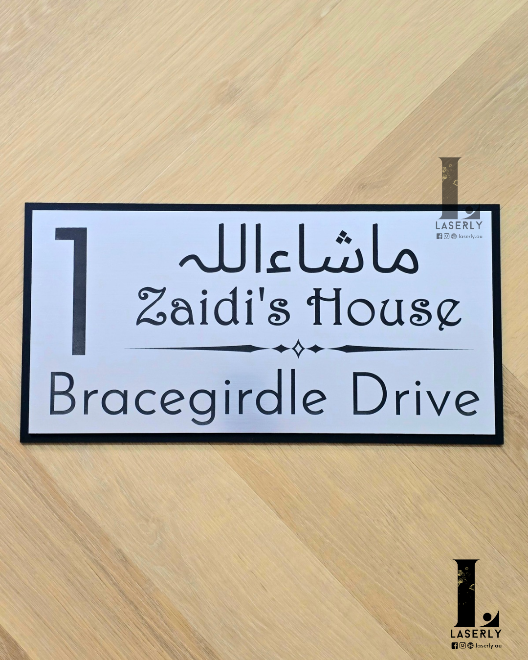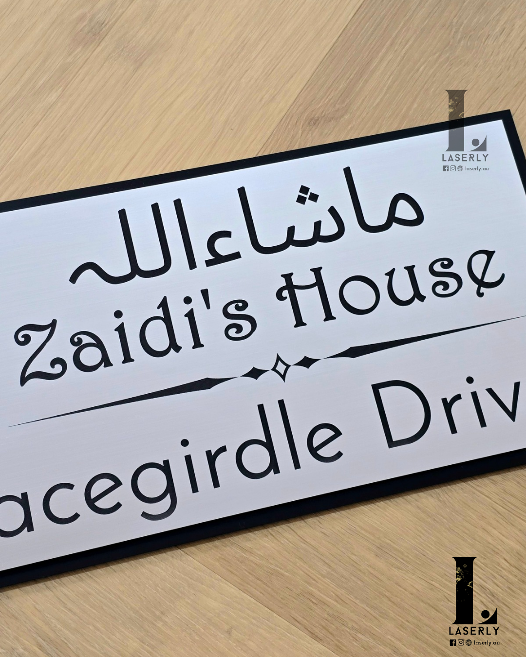 Calligraphy House Sign is crafted from matte black and silver acrylic. It can be conveniently adhered to various surfaces, such as walls or glass, using the adhesive tape provided on the back. The overall thickness of the sign is 4.5 millimeters.