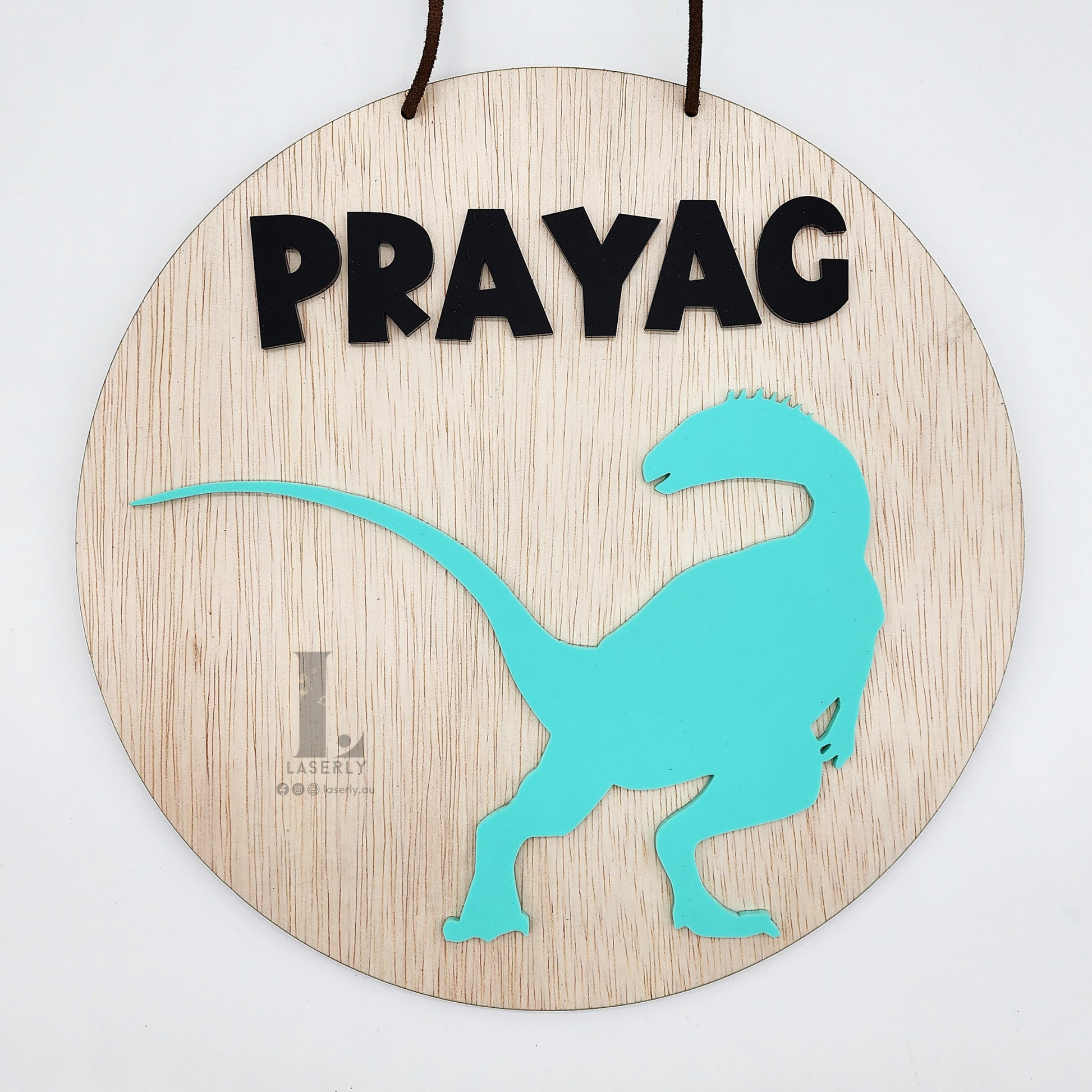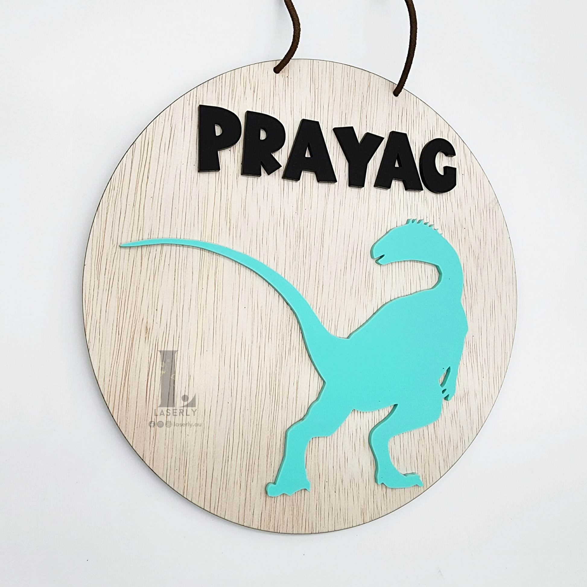 This beautiful door sign is made of 3mm plywood and acrylic for the dinosaur and name.