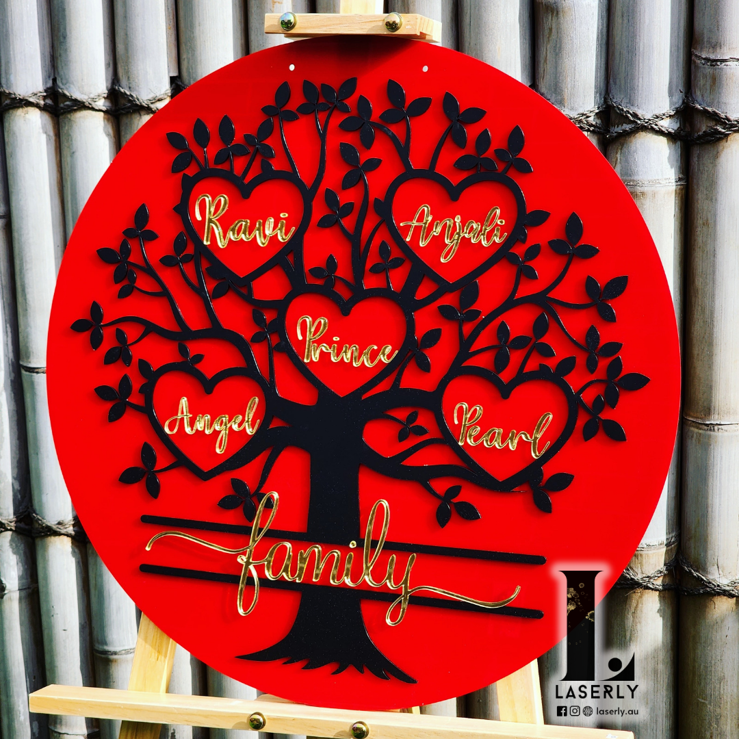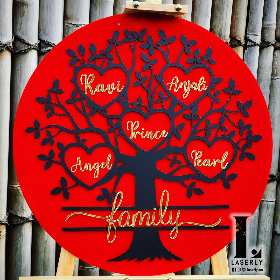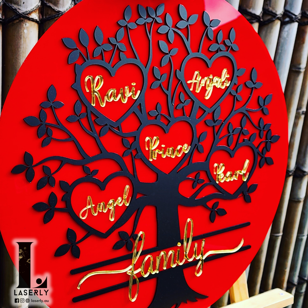 Beautiful custom family tree made of acrylic. We can add upto 10 members. Please write the names comma separated while placing order which comes in order of top to bottom. We will contact you to place the names in position you prefer before custom building it.