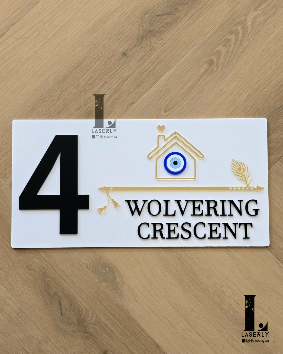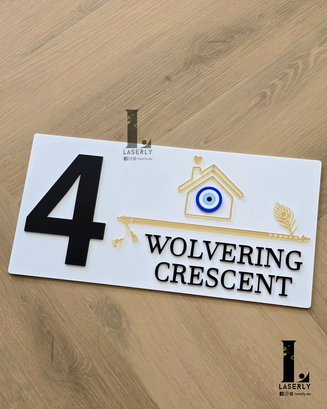 The Flute house number sign with an evil eye is crafted from golden and white acrylic. It can be conveniently adhered to various surfaces, such as walls or glass, using the adhesive tape provided on the back. The overall thickness of the sign is 6 millimeters.