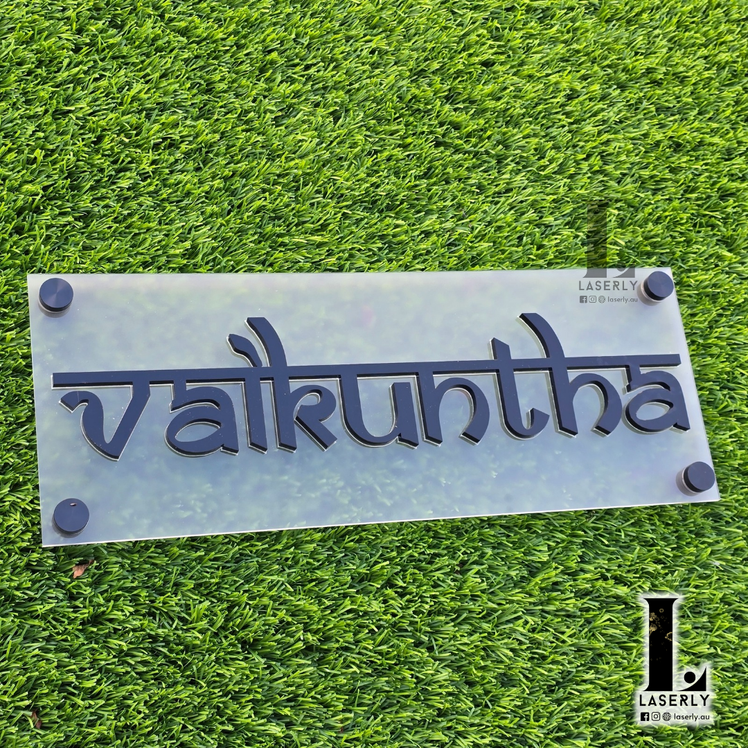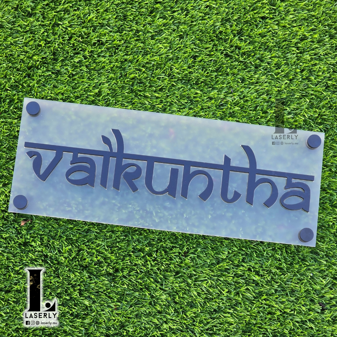 House sign made of 6mm black acrylic mounted on top of frosted acrylic. This sign comes with 4 standoffs for installation.