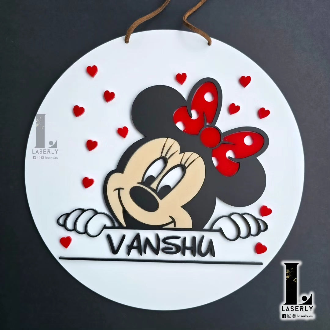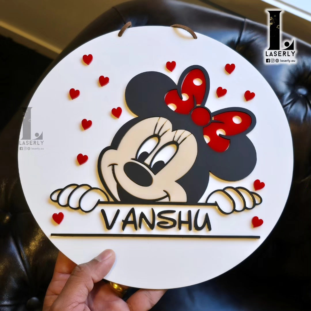 This aesthetically pleasing Minnie nursery door sign is designed to complement your child's nursery decor. Crafted from high-quality acrylic.