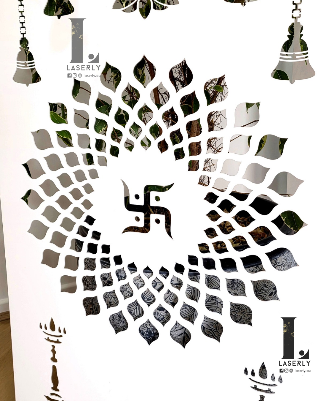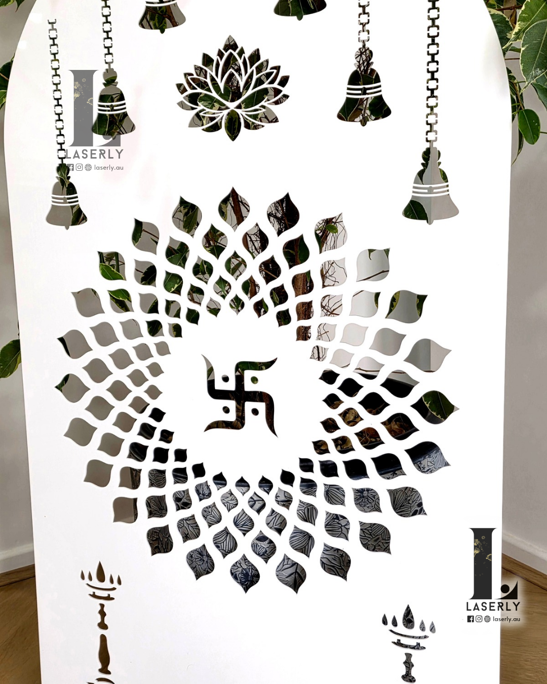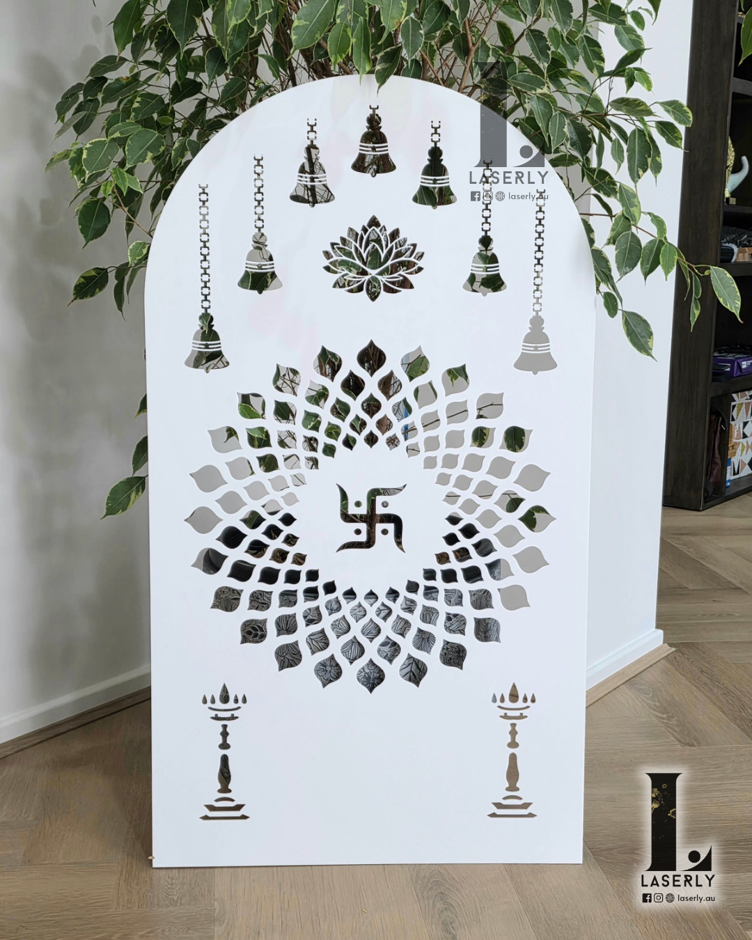 Bring a touch of elegance and spirituality to your home with our Swatika Mandir Arch in 6mm white acrylic, perfect for mandirs, cabinets, or wall décor.