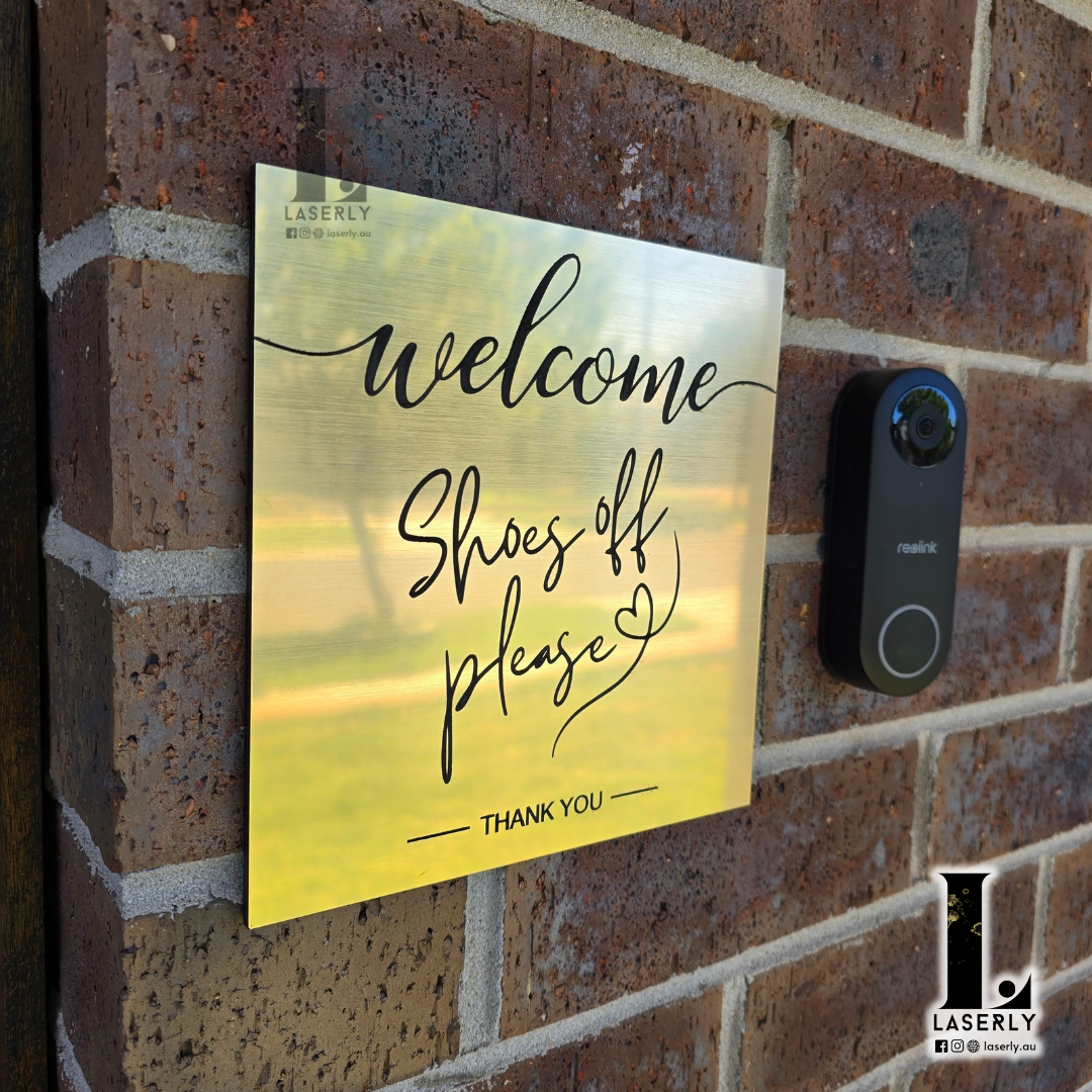 Welcome sign (Shoes off please) made of acrylic and traffolyte. Measurements: 20x20cm.